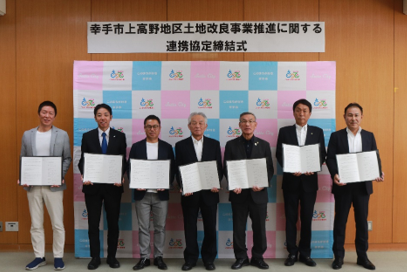 埼玉県幸手市上高野地区における土地改良事業の円滑な推進を通じて、地域の活力向上と持続可能な農業基盤の形成を実現し、地域・行政・企業の三位一体による地域の新たな価値の創造に寄与することを目的として令和7年9月22日に地域・市・事業者による連携協定を締結いたしました。