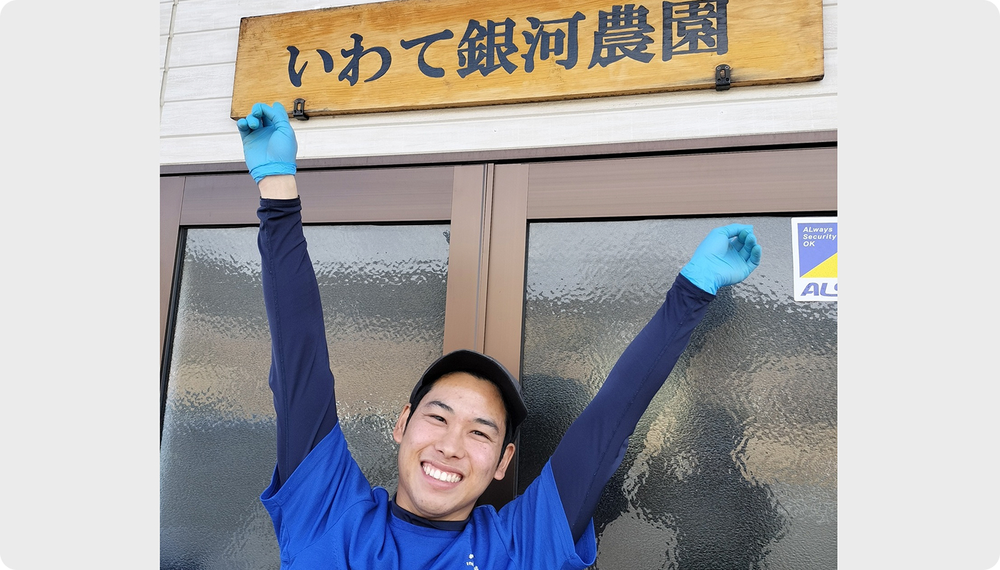 東京農業大学農学部ではポストハーベスト学研究室に所属。2024年に新卒で入社し、「いわて銀河農園」で生産管理を担当する。サッカーとスノボが趣味の双子の弟。仕事で疲れた体に塩分がしみるおせんべいの食べ比べにハマっている。