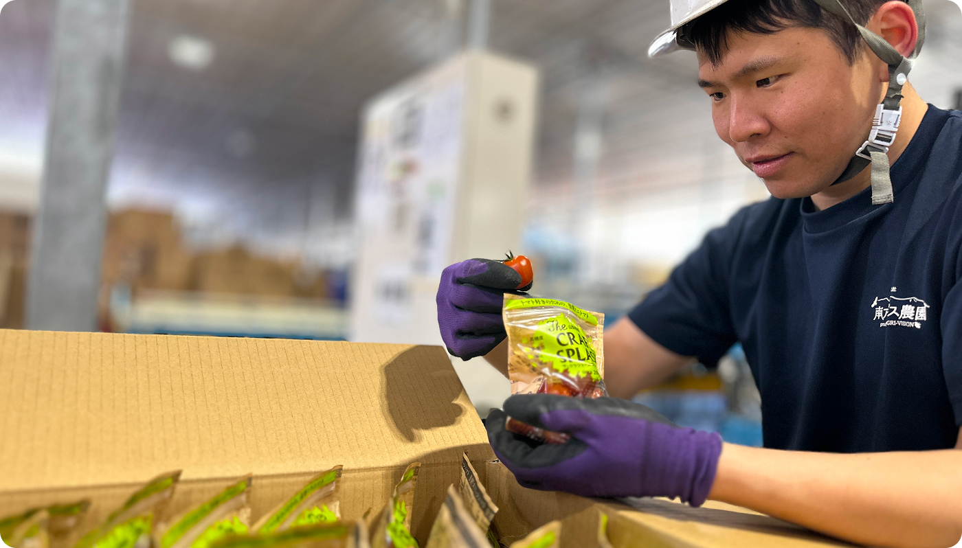 選果作業の指示出しから集荷・出荷作業まで、そのほか発注業務や労務管理、農作物を病害虫や雑草から守る防除管理なども行います。入社当時はいわゆる農作業が主な仕事だと思っていましたが、3年目ごろからはスタッフを動かすポジションになりました。グロワー(栽培管理者)や農場作業管理者、営業担当者とコミュニケーションをとりながらスムーズに進むように心がけていて、もしイレギュラーな事態になってもベストな対応ができるように、予測と事前準備を大切にしながら仕事を進めています。